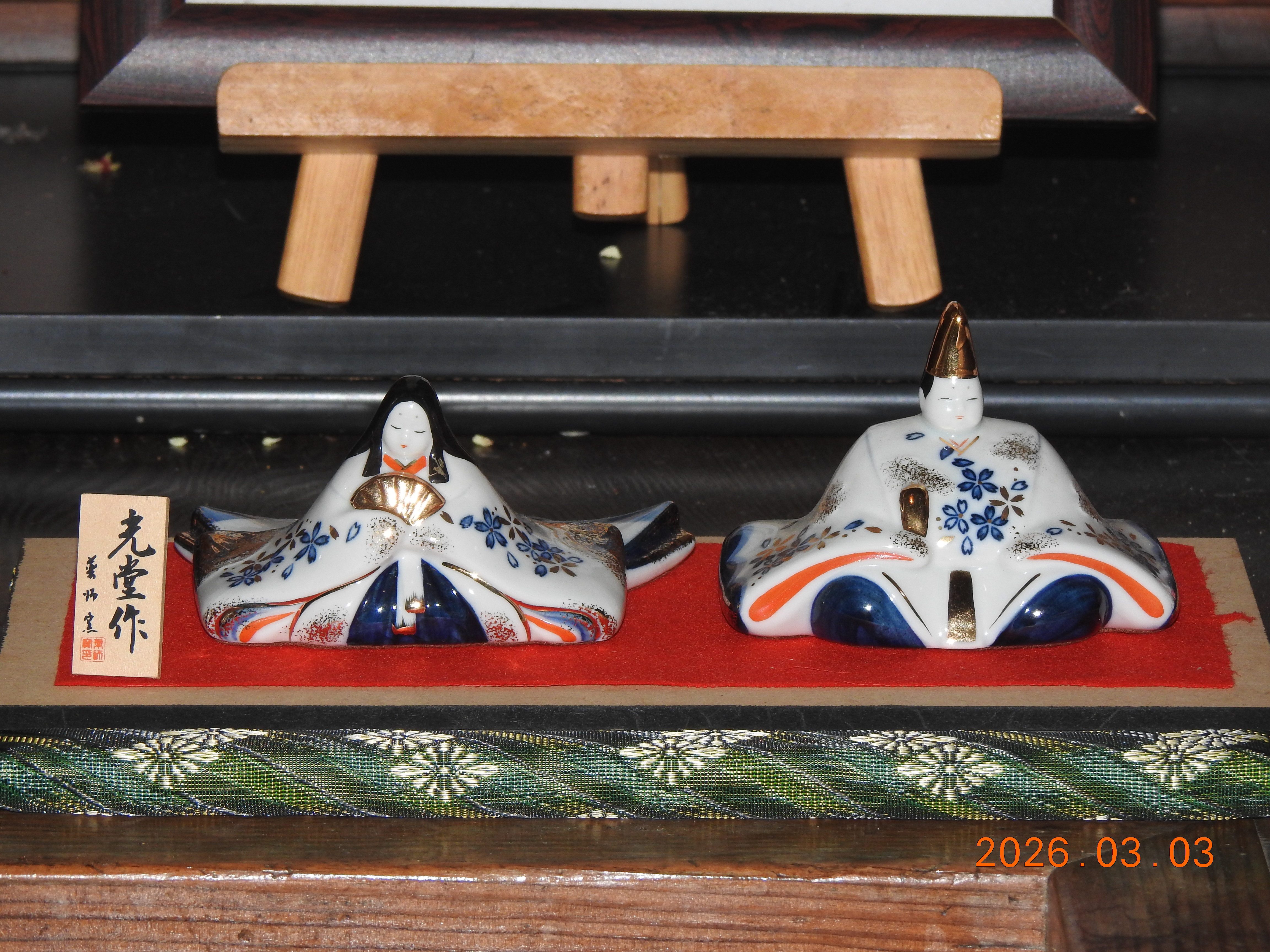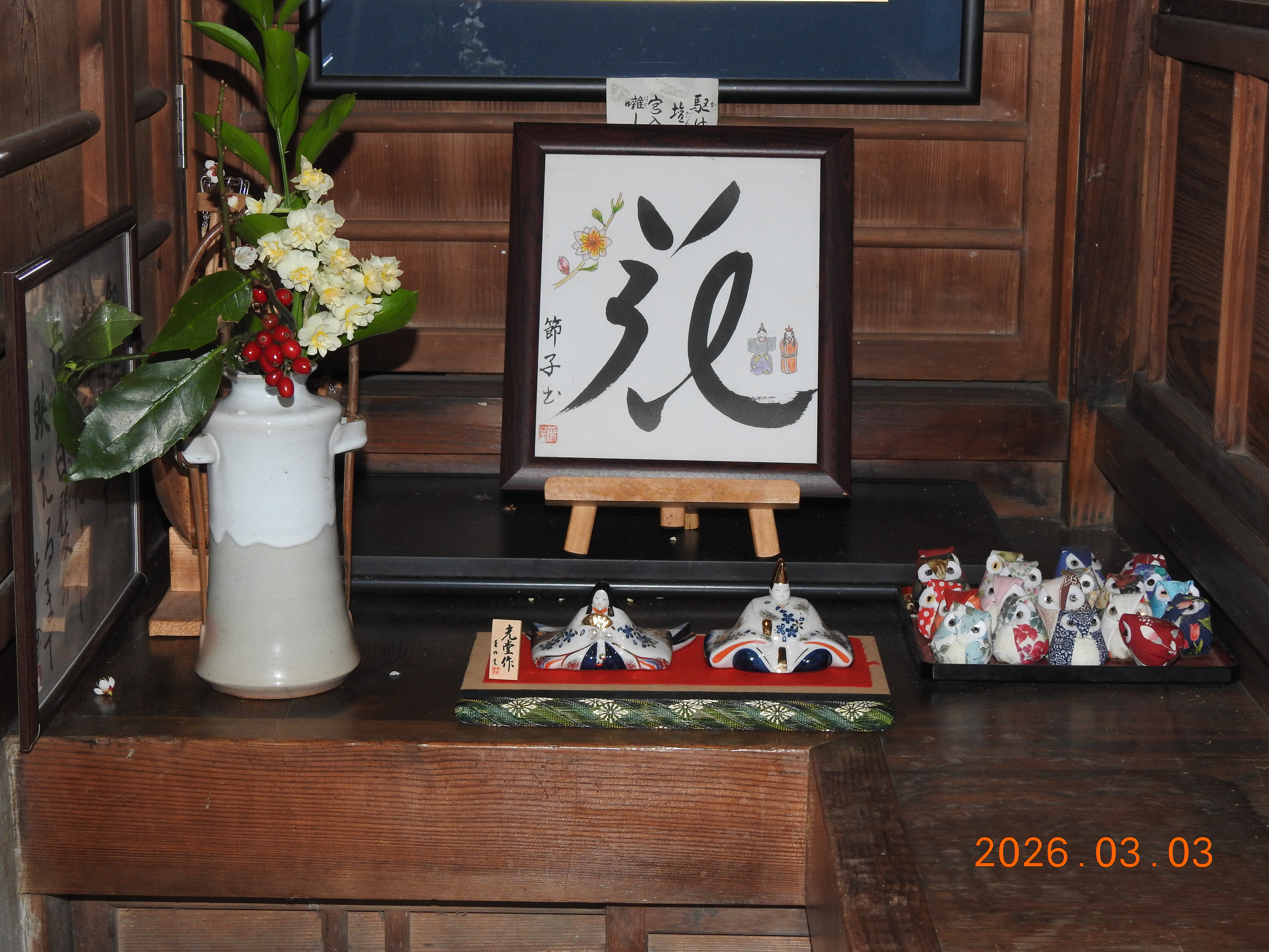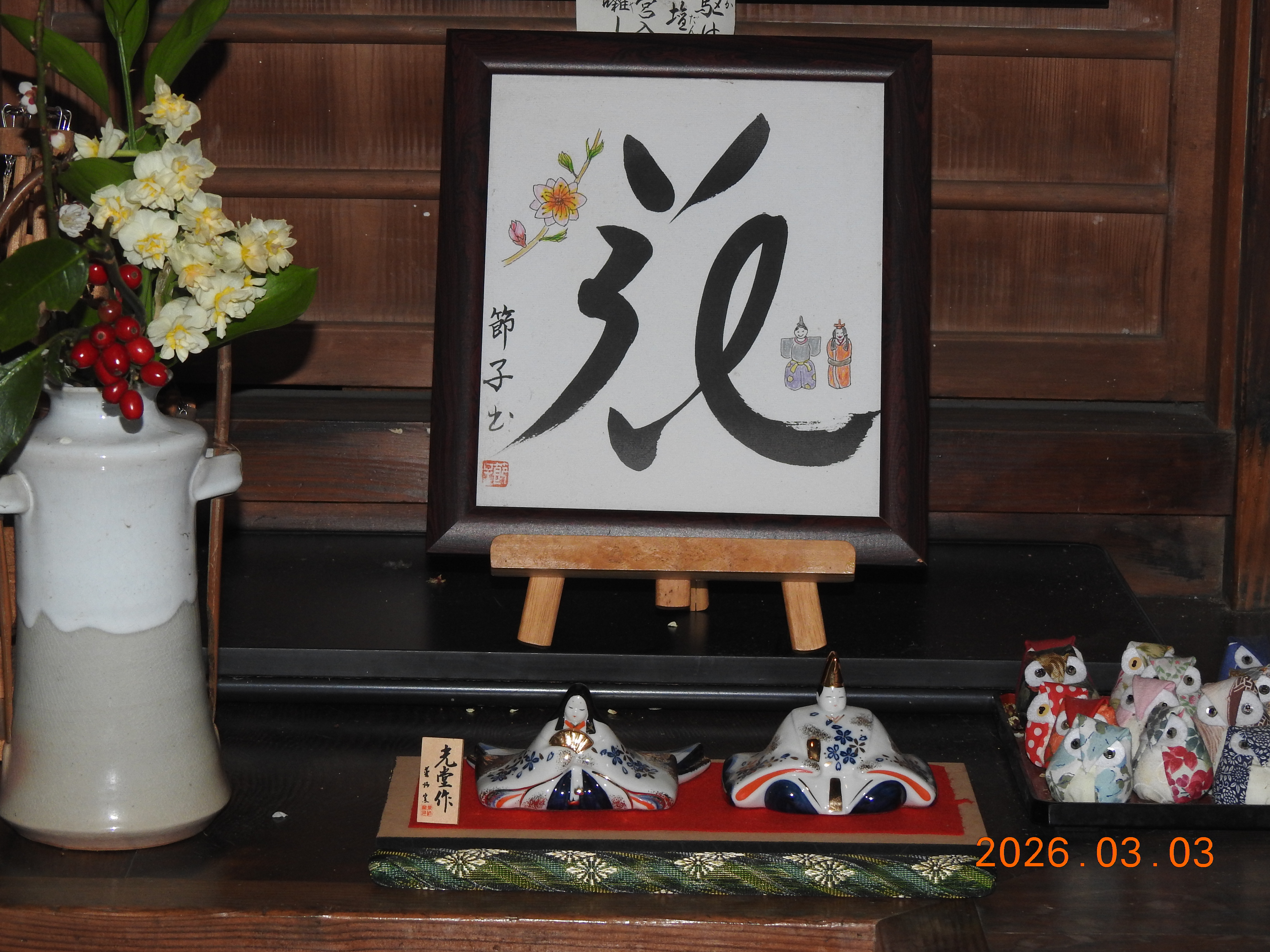 ♬☀ 3月 春到来 ☀♬ 2026-3-3更新 弥生3月3日、桃の節句、ひな祭り ささやかながら、例年のように、 陶器製の男雛(おびな)と女雛(めびな)の一対を 3月1日から玄関間の片隅に飾り置きしています。 桃の節句日の3月3日、 関西地方は朝から小雨が降り続いています。 しっとりとして落ち着いた雰囲気です。